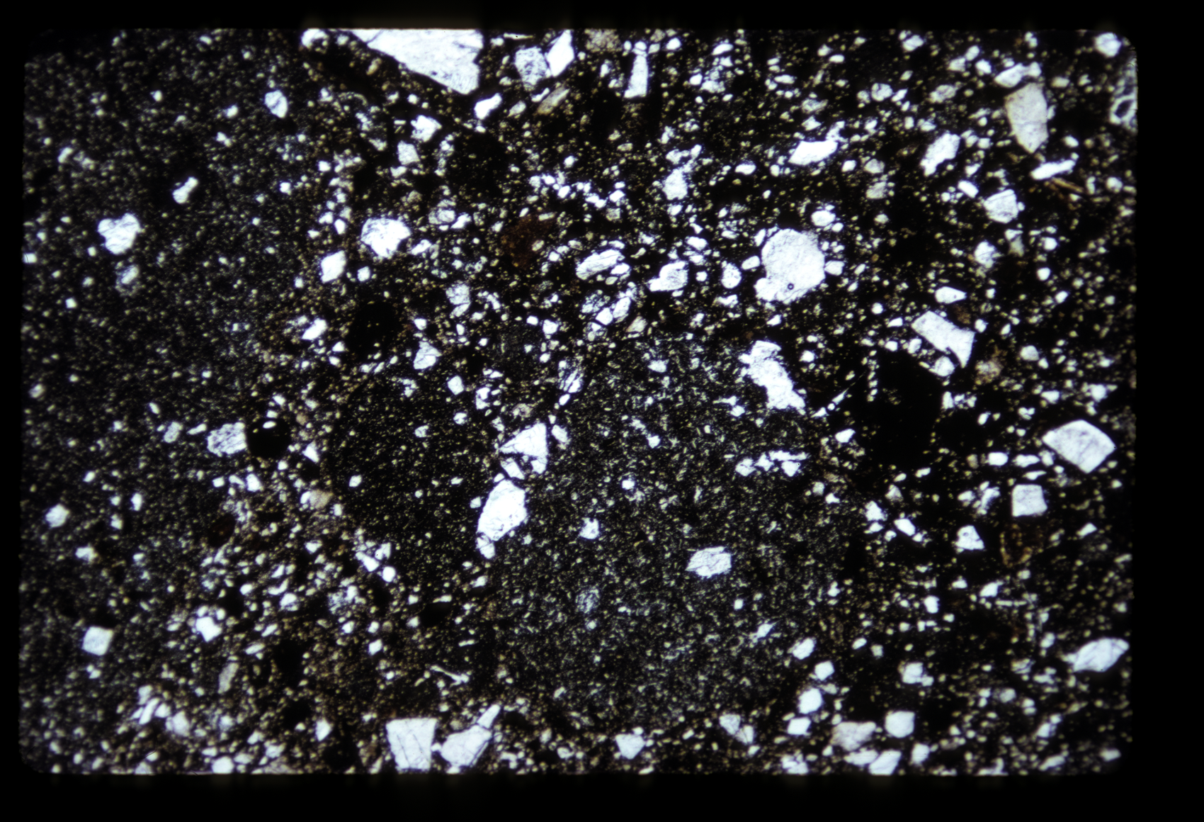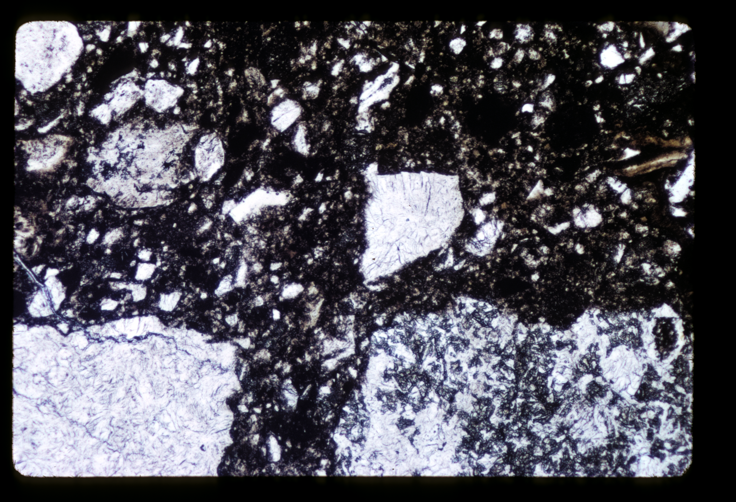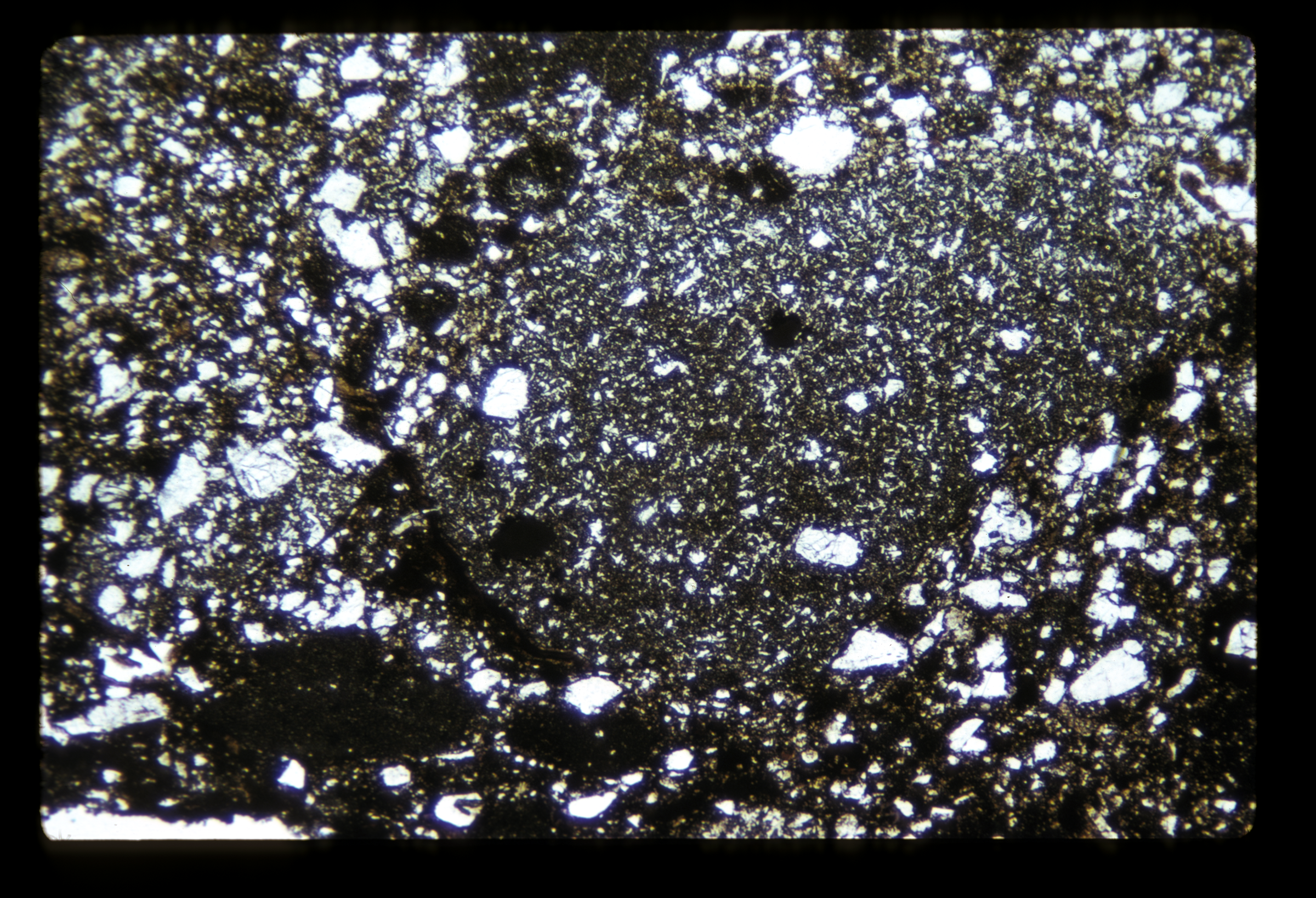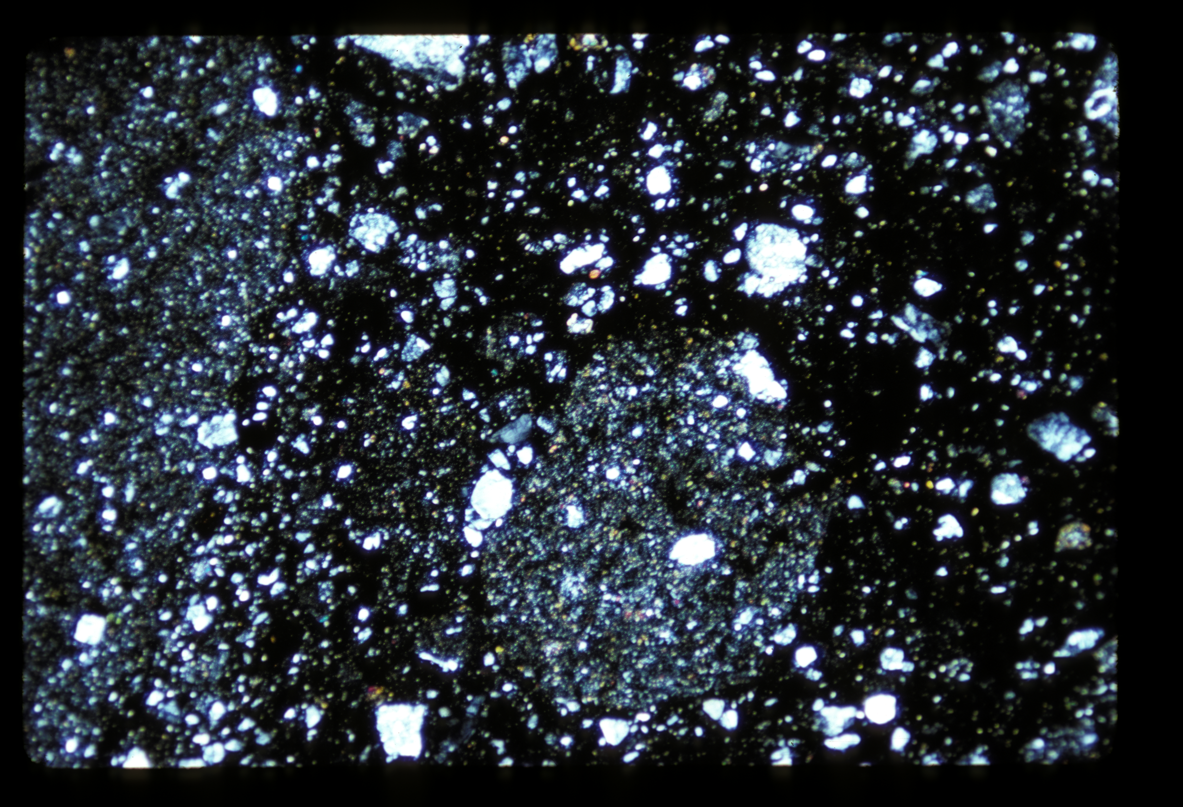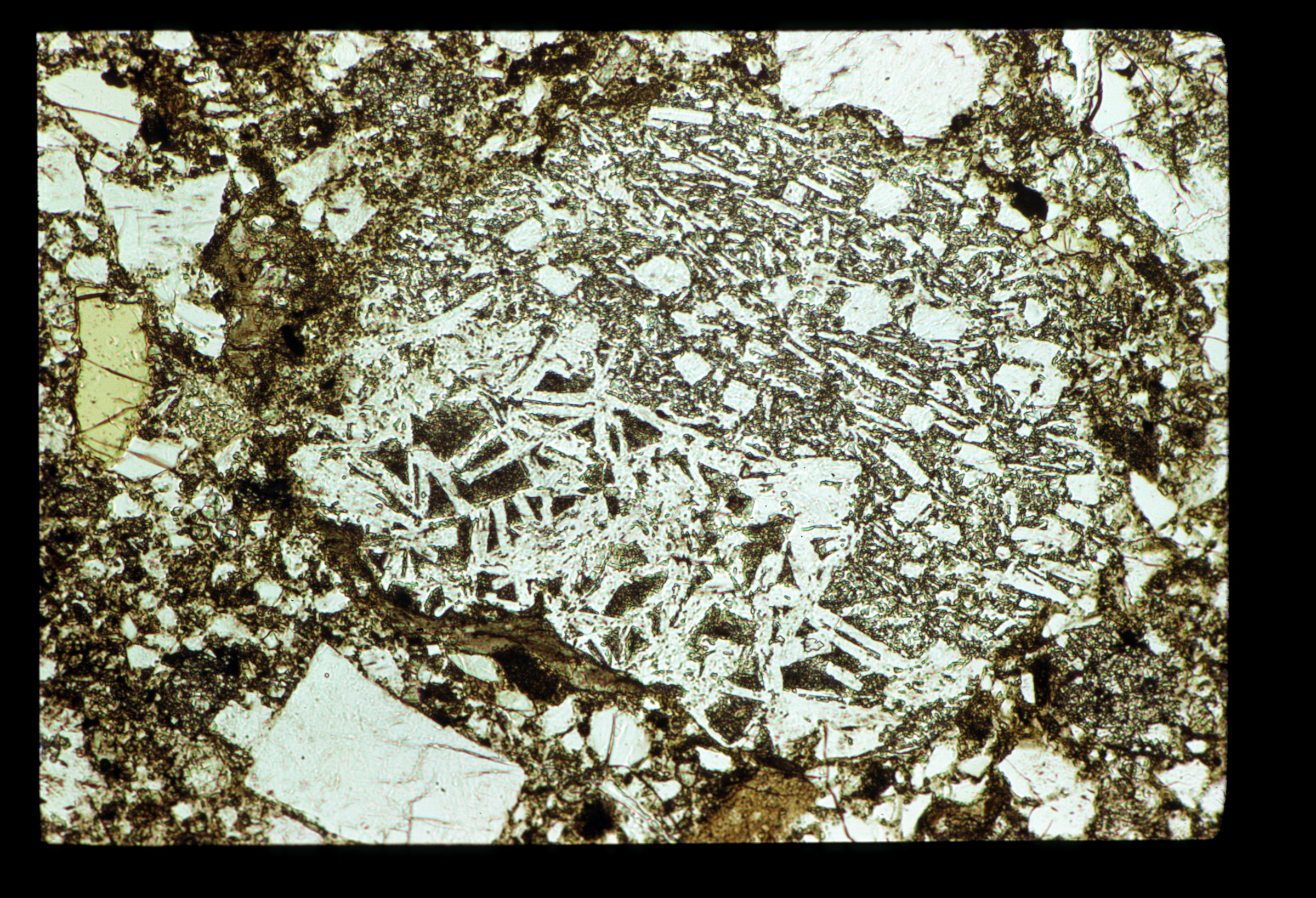 60019 | 14 | Apollo 16 / LM/ALSEP/10/10' | 2 intergranular basalt in center, fine one banded, in clast with partial glass selvage | 25x | 30 | Wilshire | ap1603_16_12 |