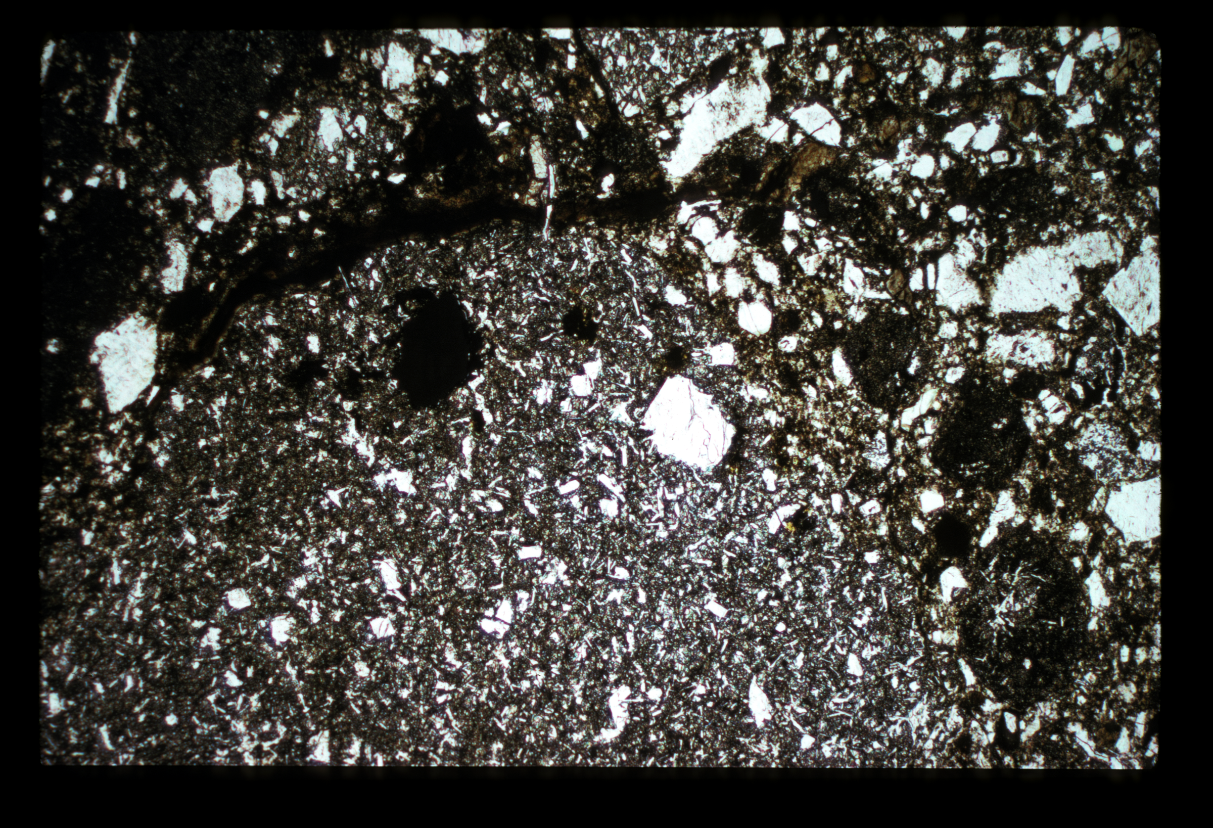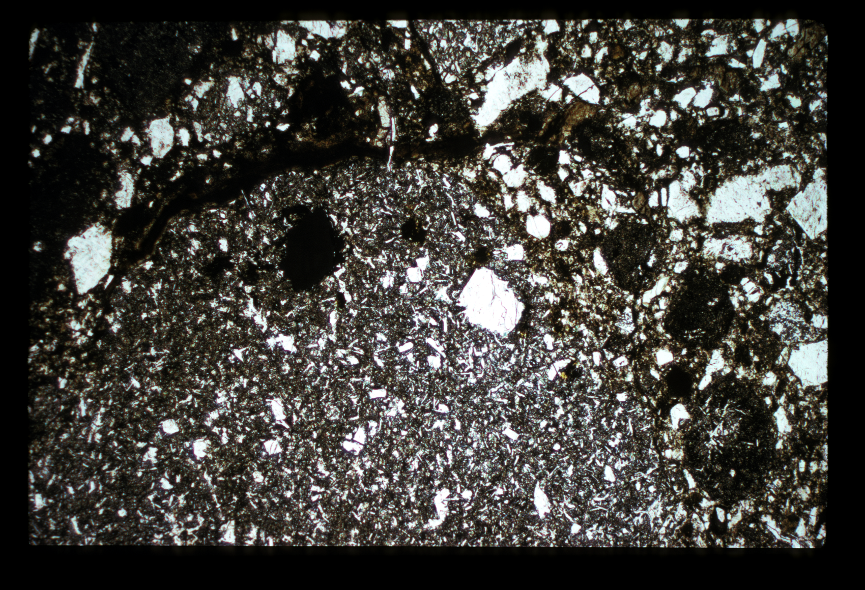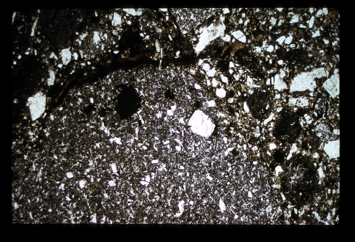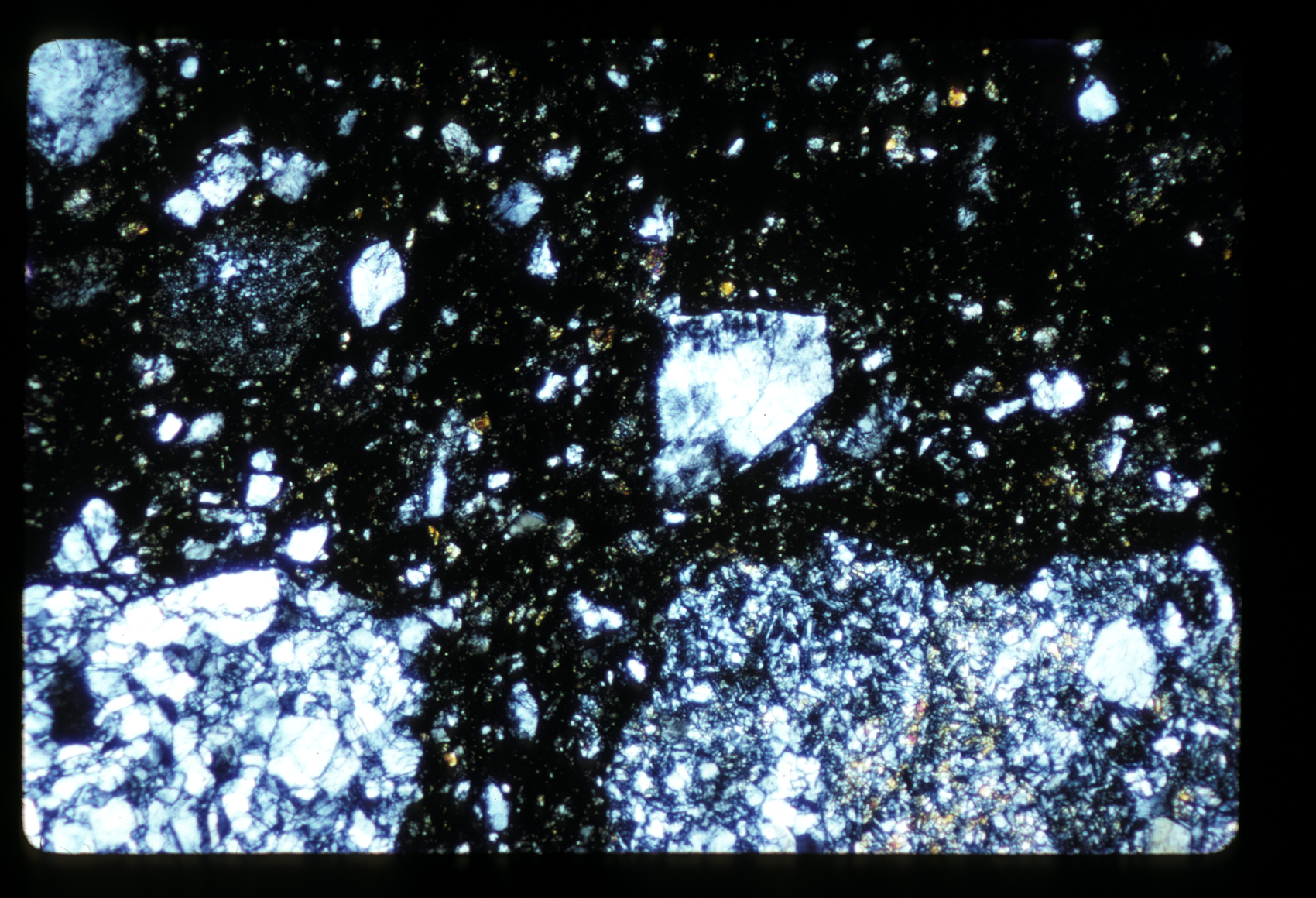 60019 | 14 | Apollo 16 / LM/ALSEP/10/10' | 2 intergranular basalt in center, fine one banded, in clast with partial glass selvage | 25x | 30 | Wilshire | ap1603_16_12 |