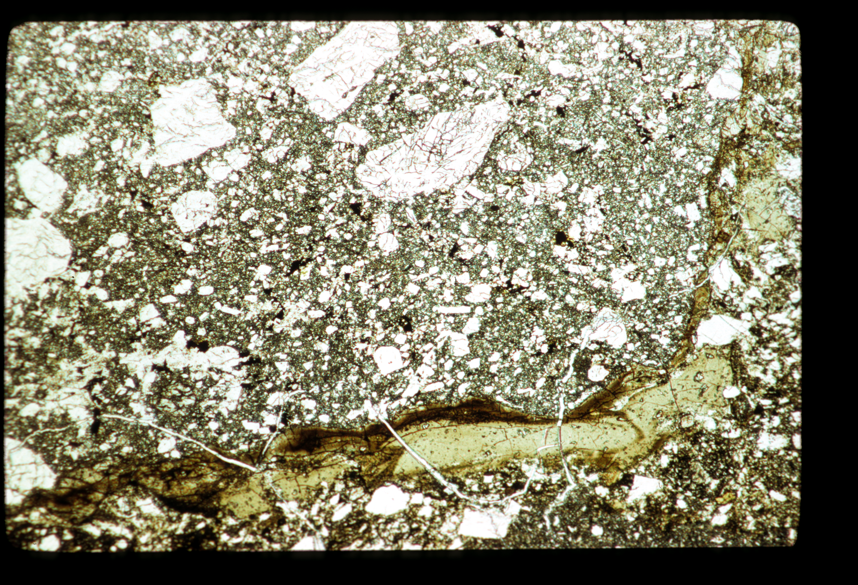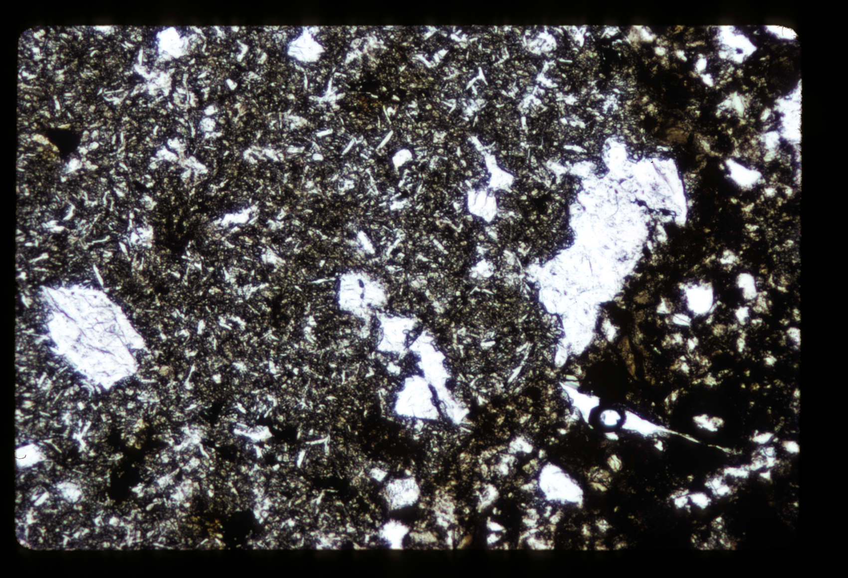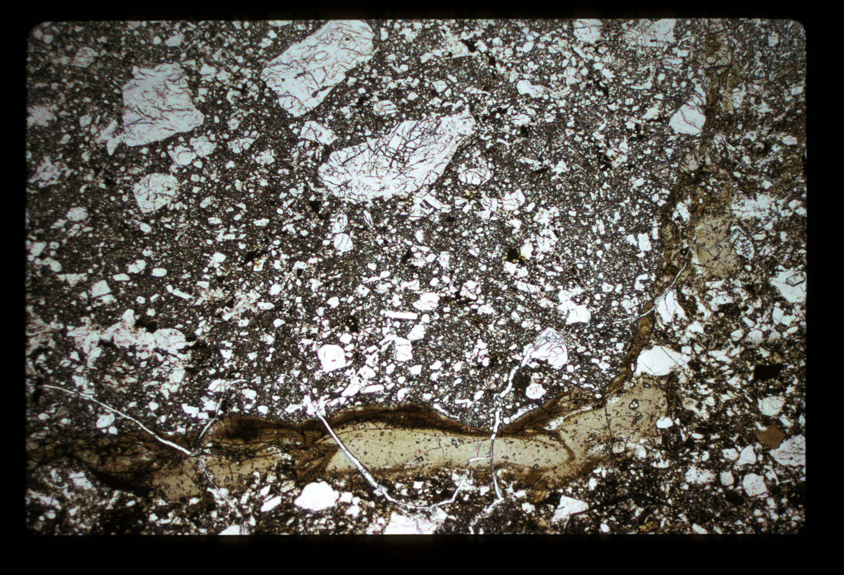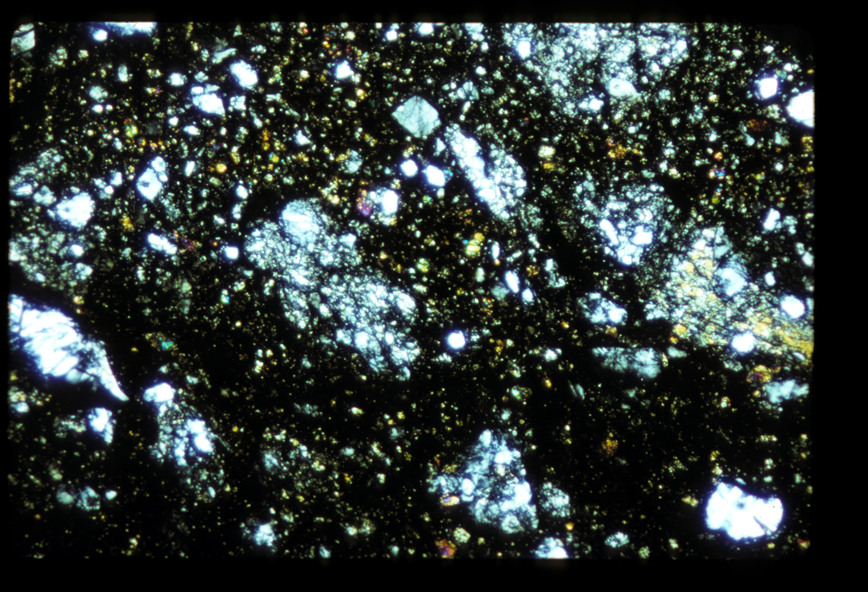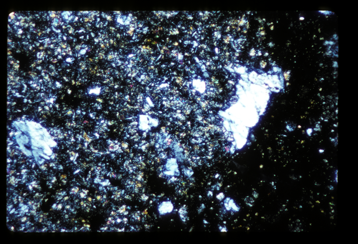 60019 | 14 | Apollo 16 / LM/ALSEP/10/10' | 2 intergranular basalt in center, fine one banded, in clast with partial glass selvage | 25x | 30 | Wilshire | ap1603_16_12 |