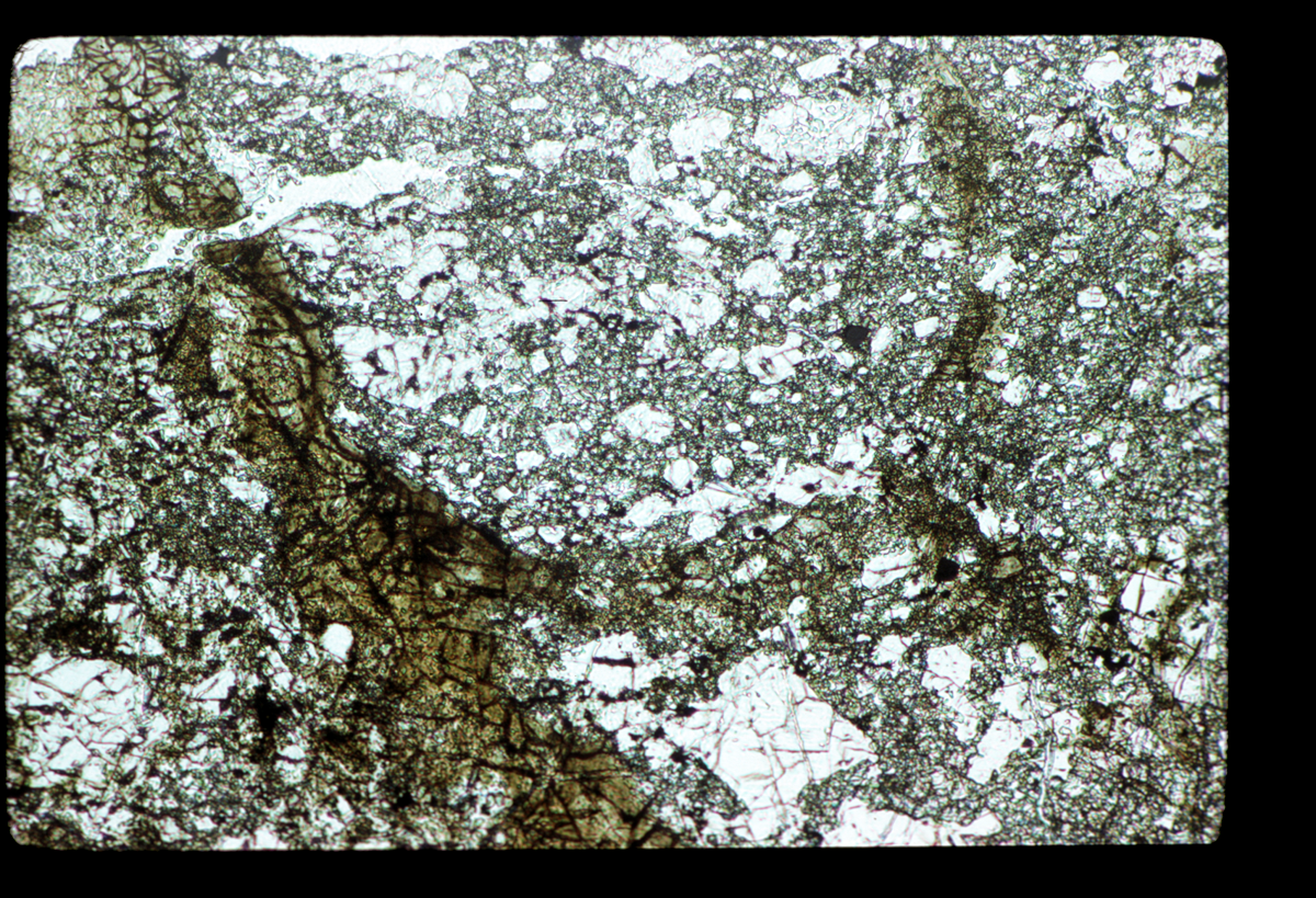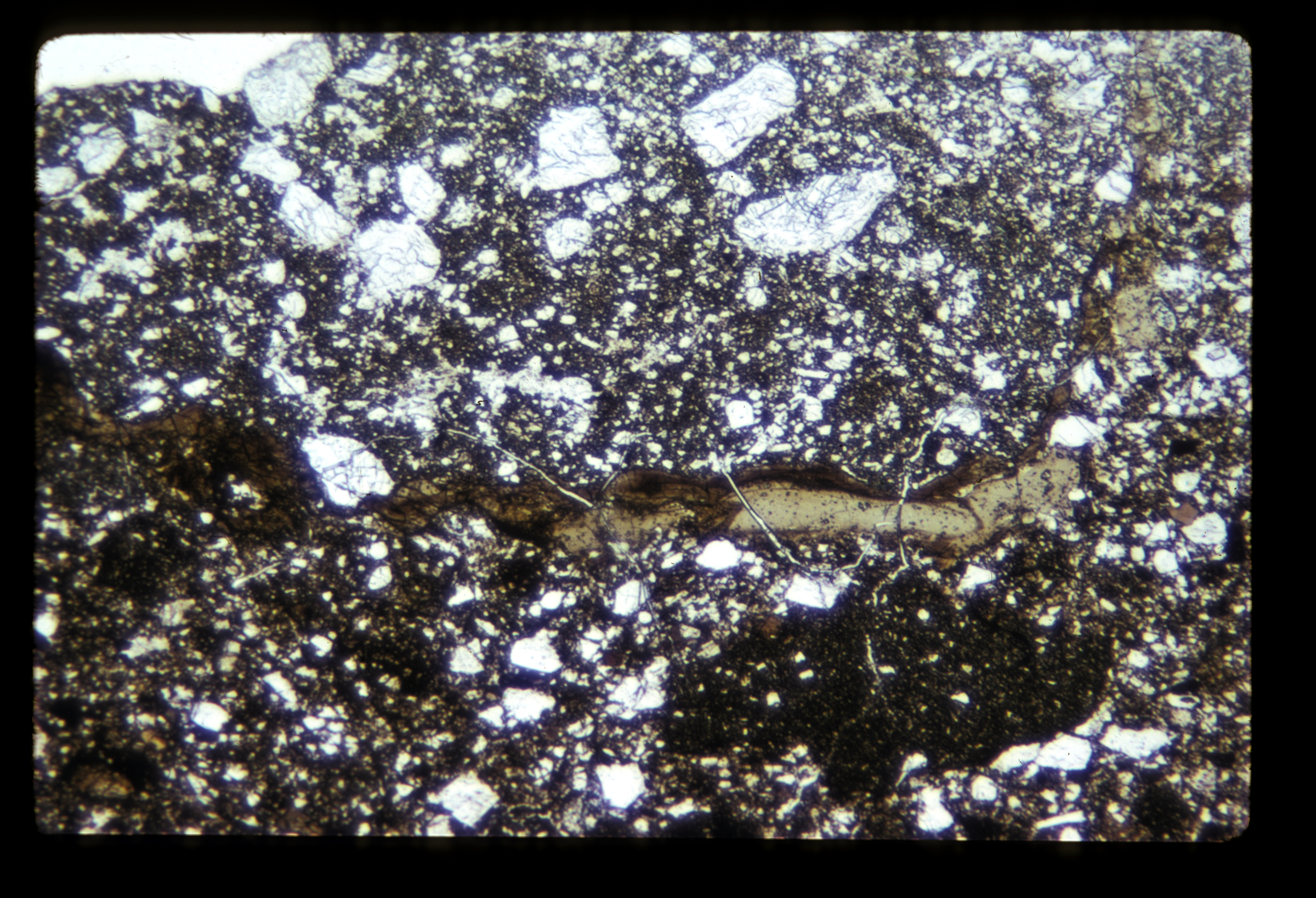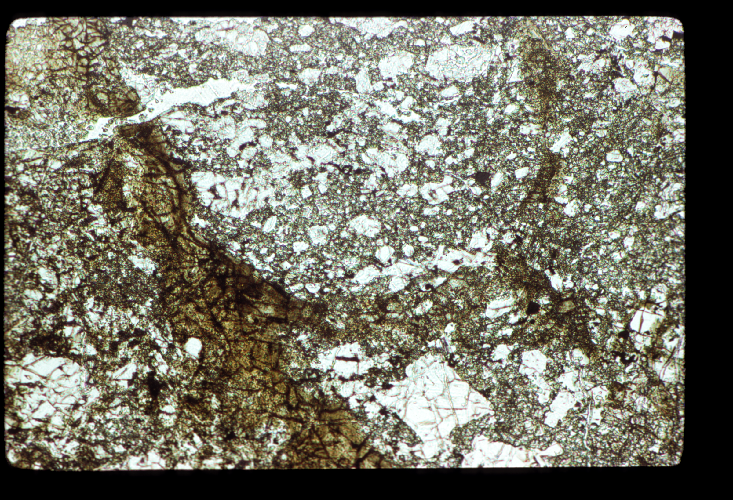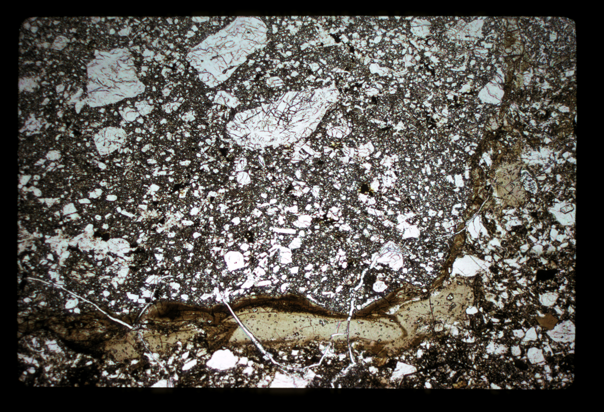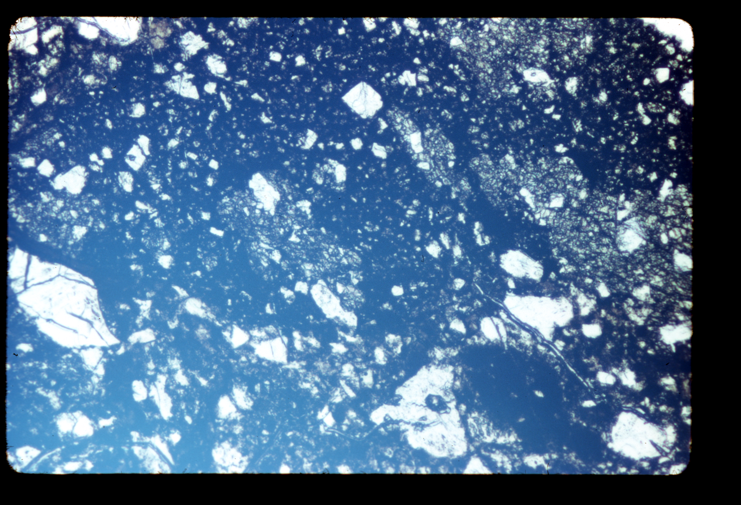 60019 | 14 | Apollo 16 / LM/ALSEP/10/10' | 2 intergranular basalt in center, fine one banded, in clast with partial glass selvage | 25x | 30 | Wilshire | ap1603_16_12 |