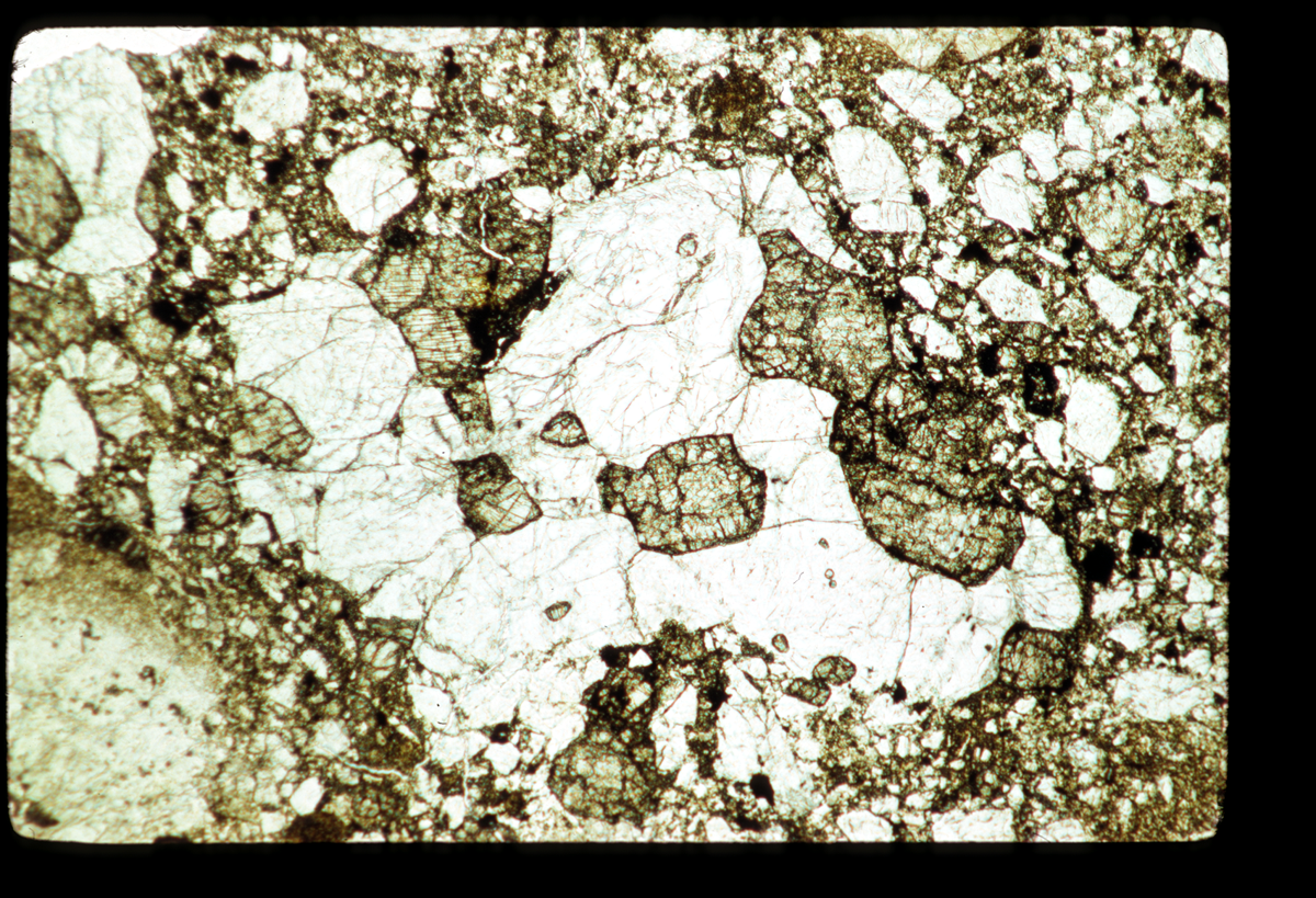 60019 | 14 | Apollo 16 / LM/ALSEP/10/10' | Gabbro? clast - crushed but original texture intact | 10x | 33 | Wilshire | ap1603_16_15 |