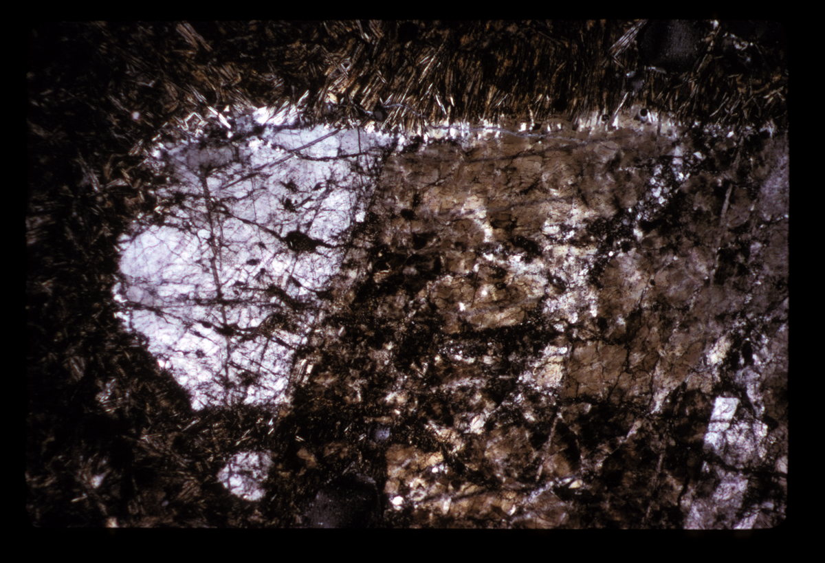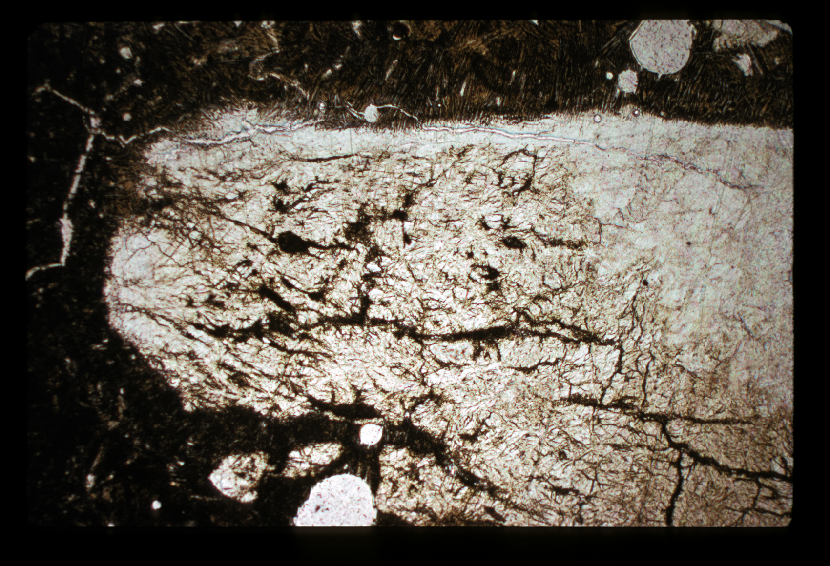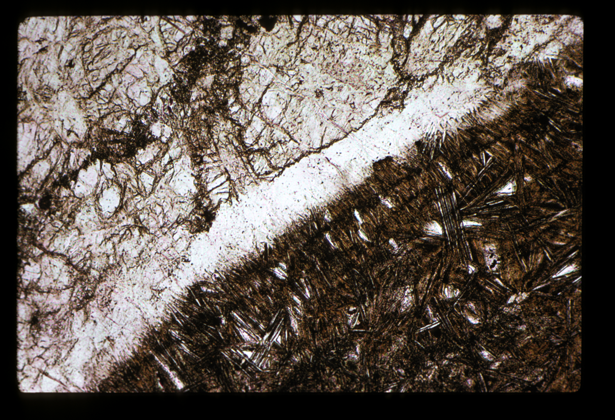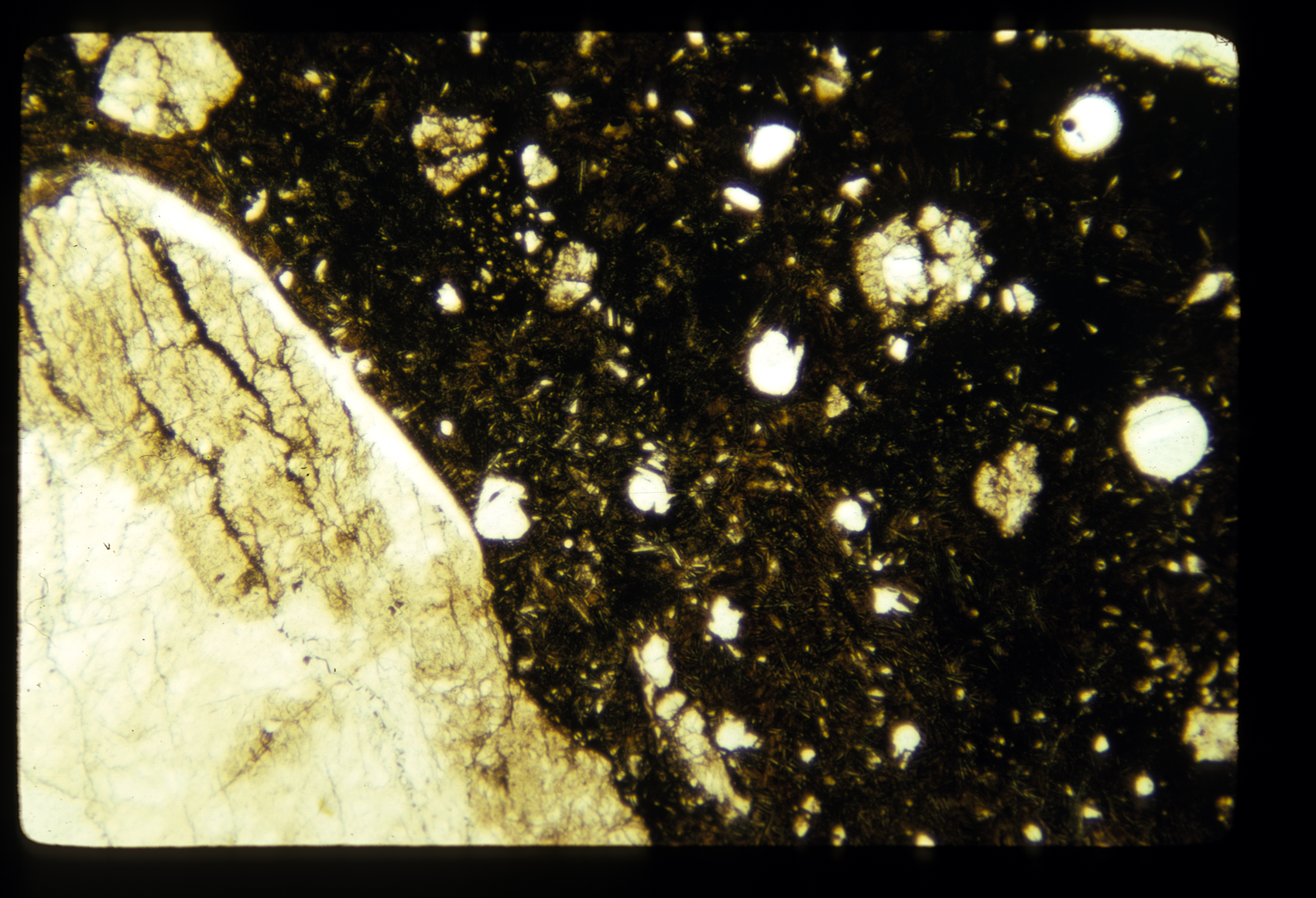 65056 | 13 | Apollo 16 / 5 | Edge of anorthosite clast in melt. Note clear band in anorthosite. Plagioclase laths rooted in clear zone | 3.4 | 22 | Wilshire | ap1605_12_03 |