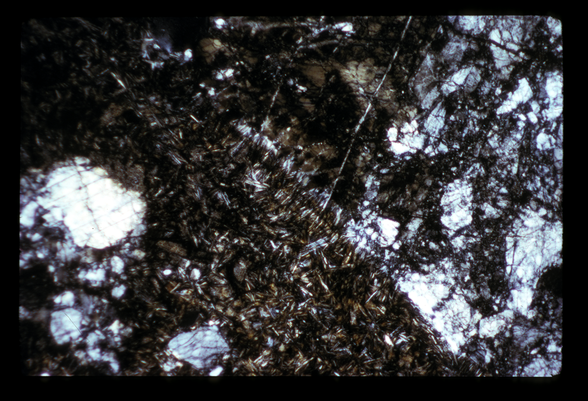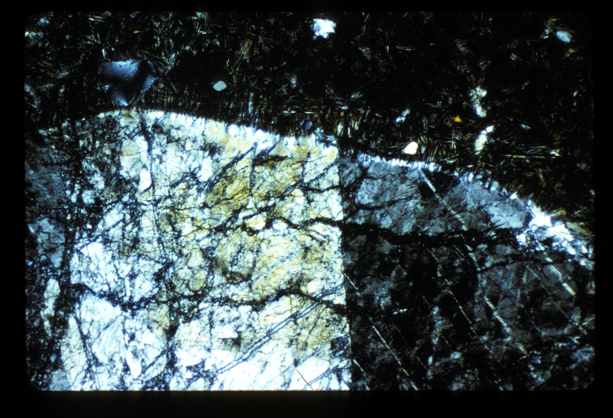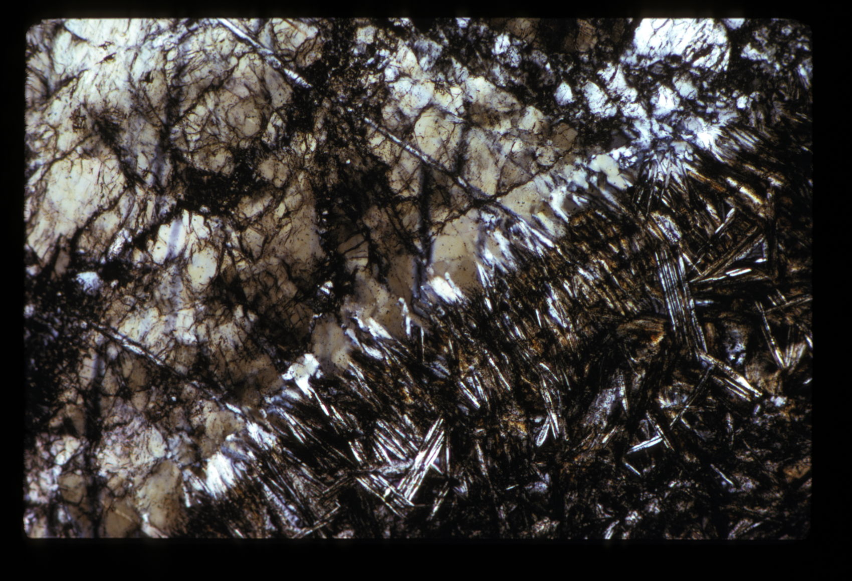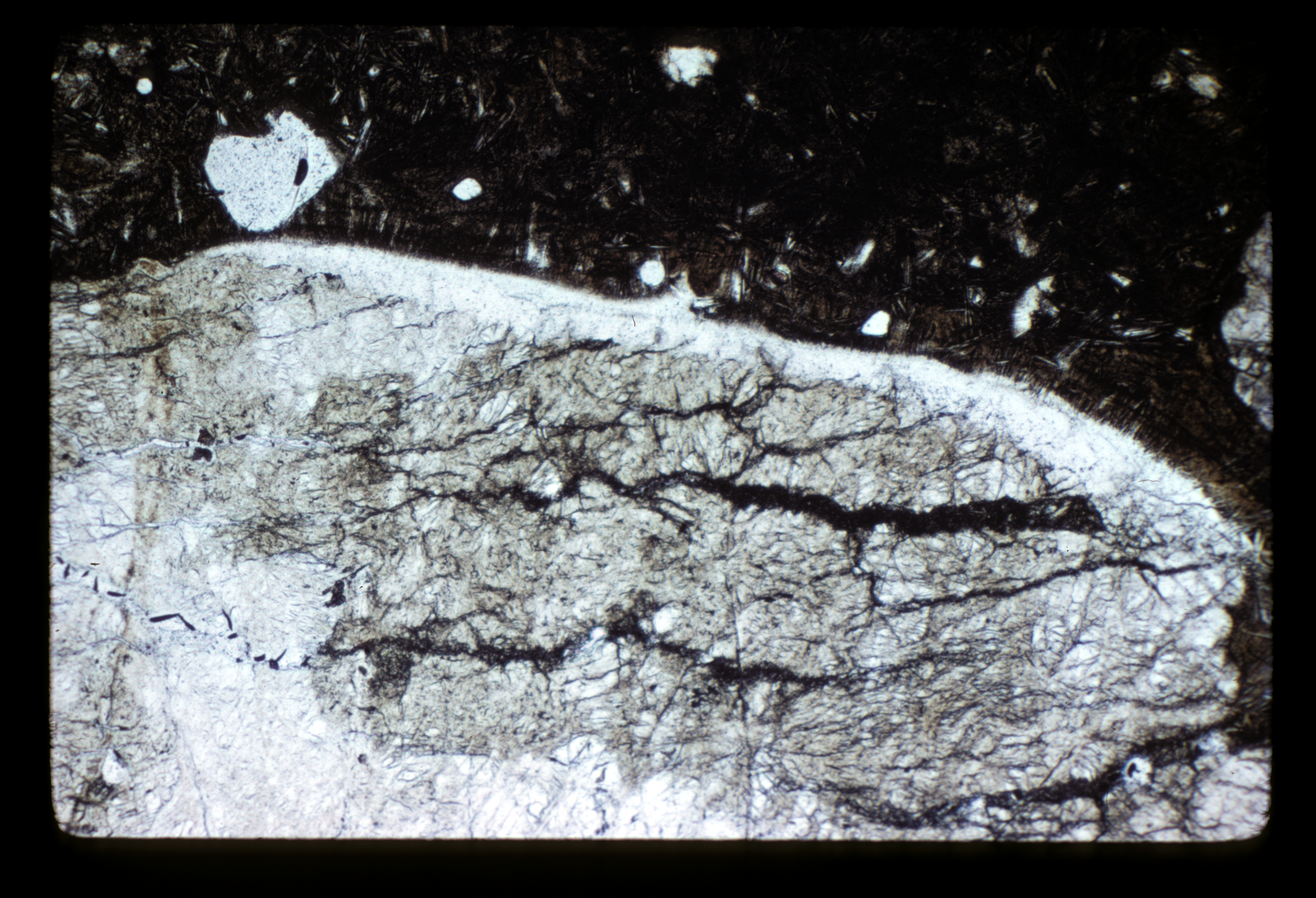 65056 | 13 | Apollo 16 / 5 | Edge of anorthosite clast in melt. Note clear band in anorthosite. Plagioclase laths rooted in clear zone | 3.4 | 22 | Wilshire | ap1605_12_03 |