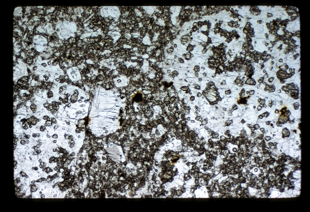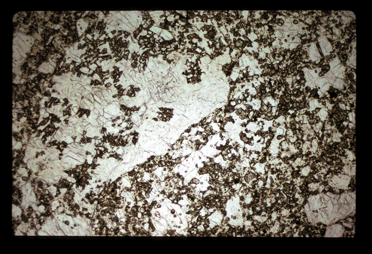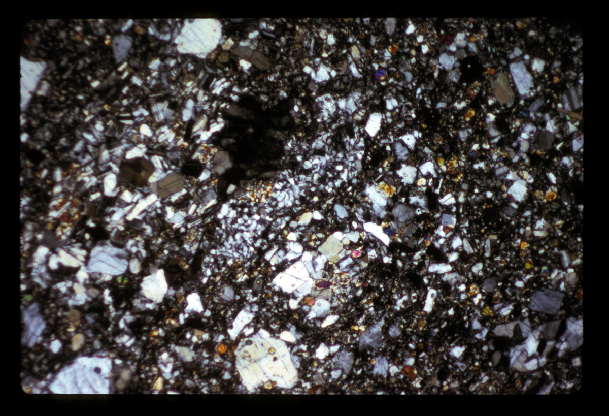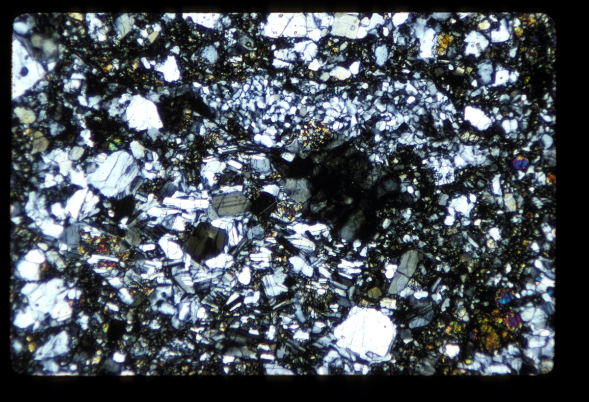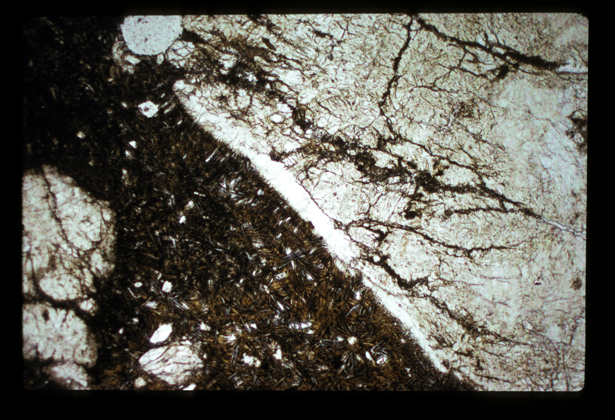 65056 | 13 | Apollo 16 / 5 | Edge of anorthosite clast in melt. Note clear band in anorthosite. Plagioclase laths rooted in clear zone | 3.4 | 22 | Wilshire | ap1605_12_03 |