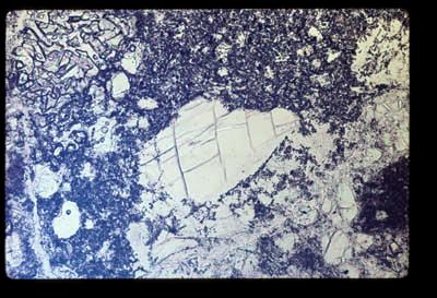 | Comments: | Composite metaclastic with lithic fragment of orthopyroxene enclosing plagioclase, clinopyroxene? Plagioclase laths in recrystallized matrix | |